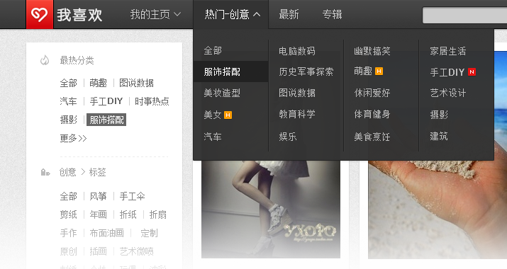 在多次的调整和尝试中,最终决定使用如下版本。介于网站展示内容以图片为主,深色导航更能够压住页面内容,同时logo的形象的展示会更充分。新的导航采用了吸顶式设计,将分类选择融入到导航中,在页面浏览的任何时候都可以做快速切换,优化了网站浏览体验。