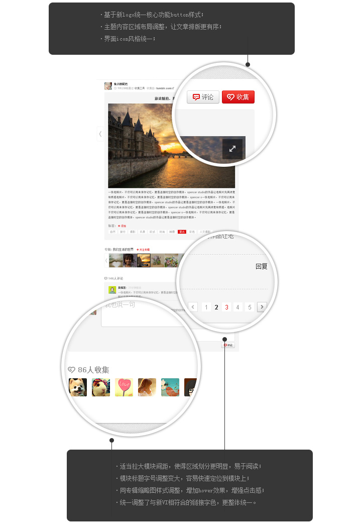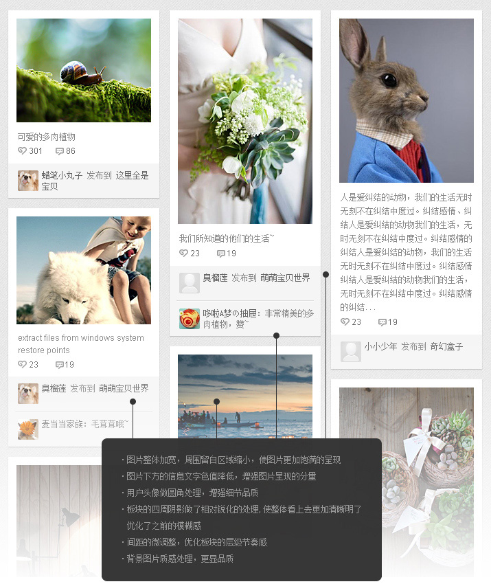 在整个项目的设计的过程中做了很多细节上的微调整,有些时候必须一像素一像素的比对调整,提高内容的可读性。对于瀑布流上每个版块之间的间距,先适当放大,再去测试,不合适再一点点的缩小,去一次次的寻找最佳的间距尺寸。这样做一方面使页面更整体有序,同时也增强了内容的可读性。设计上哪怕一个微小的变化都可能会带来一些预想不到的影响。有时候真正的挑战不是修正你发现的问题,而是修正这些问题的同时不破坏已经正常运行的部分。用户体验的改善不仅仅是交互上的易用、视觉上的美观,产品本身的可用性是构建上层建筑的基础,基础体验的优化是不容忽视的。